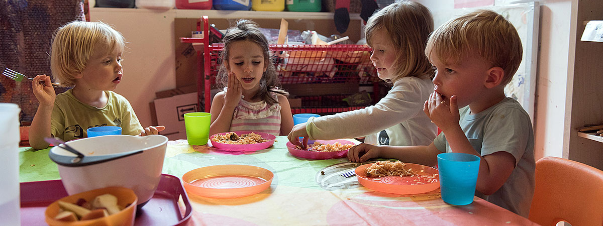 Meals aim to be like family occasions; staff sit with children in small groups and engage in conversation. We encourage children to try different foods, in a positive food environment, where they are allowed to make choices about what they eat and how much they eat. Children are supported to feed themselves, to use cutlery and open cups or free flowing beakers for the youngest.
