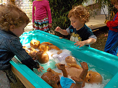 There is sand and water play and other kinds of sensory and malleable play materials such as play dough and cornflour gloop. Adults engage with toddlers through the provision of a variety of activities that stimulate a wide range of their senses and support active involvement on the part of the child.